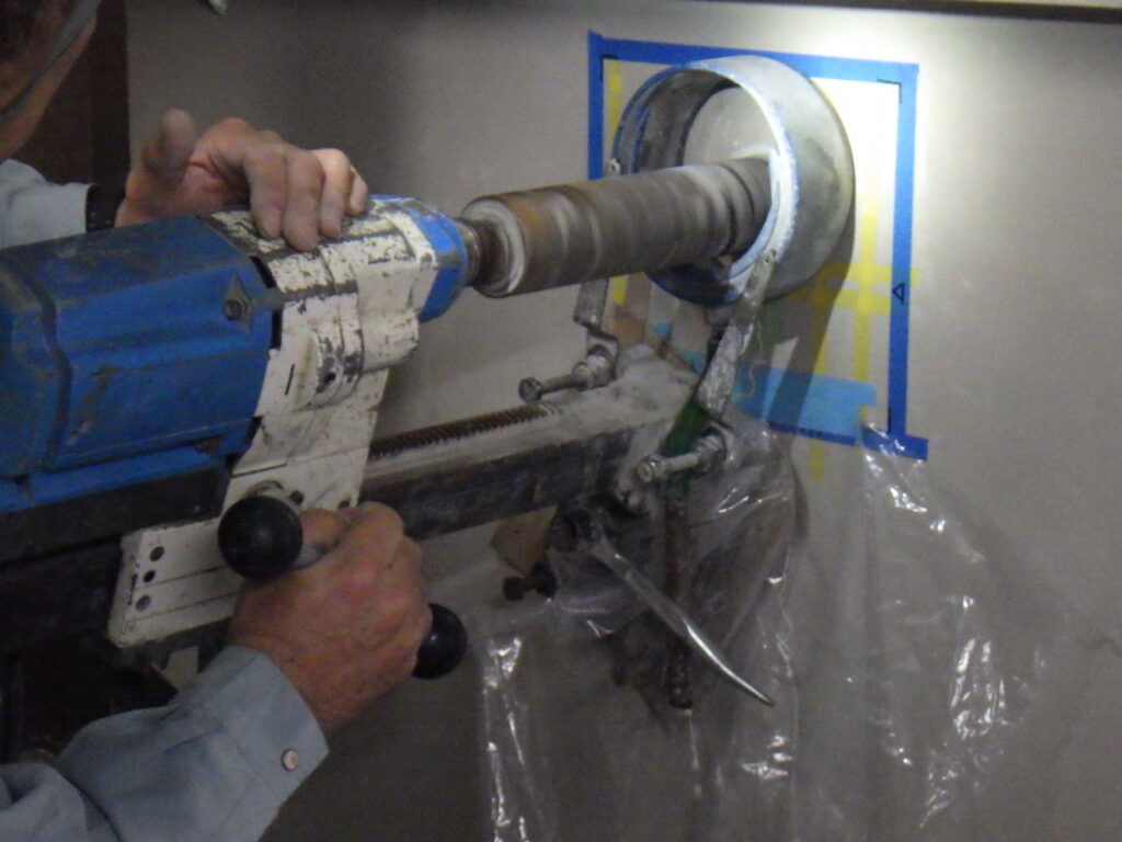 コア工事とは、コンクリートやRC壁・床などに専用のコアドリルを使用し、円形の穴をあける工事です。